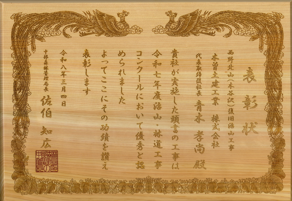 この度、中部森林管理局長賞として治山の部で表彰をいただきました。